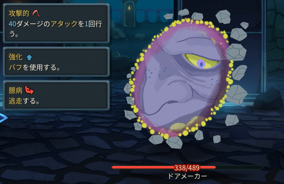 身代わりであるドアの状態で開始。1T~3Tを繰り返す。体力をすべて削ると本体であるドアメーカーがスタン状態(そのターン行動しない)で現れる。