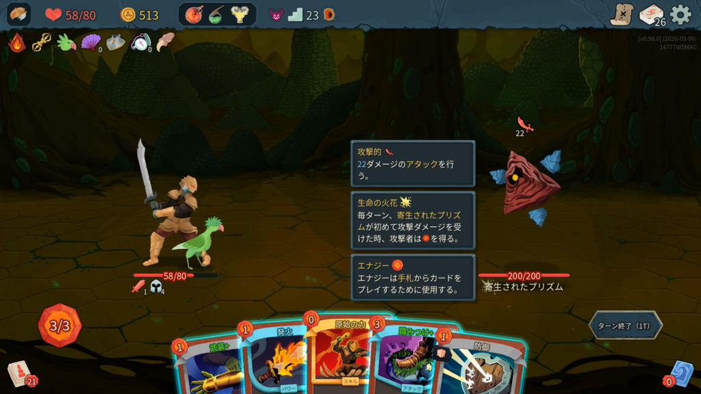 1T~4Tの行動を繰り返す。能力の「生命の花火」により、寄生されたプリズムに攻撃ダメージを与えるとエナジー1を得る。ブロックされてダメージがHPに達しなかった場合は発動しない。